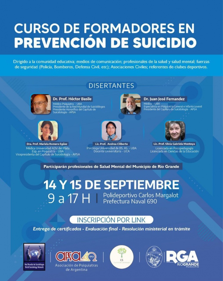 Disertarán reconocidos profesionales de la Asociación de Psiquiatras de Argentina, integrantes de la Red Mundial de Suicidólogos, como así también de Salud Mental del Municipio de Río Grande.