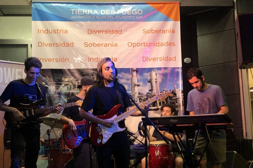 La noche empezó con la presentación del sonido de una guitarra y bajo de hechos con madera de lenga fueguina. Los encargados de la presentación fueron Guido Lujan Trío, un ensamble de músicos fueguinos compuesto por Guido Lujan (voz) Matías Mendoza (batería) y Marcelo Navarro (bajo) que compartieron temas propios y algunos covers de rock y blues argentino.