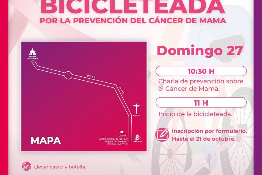La “Bicicleteada por la Prevención del Cáncer de Mama”se realizará el domingo 27 de octubre a las 11:00, partiendo desde el Centro Integral de la Mujer “Mujeres Centenarias” (Prefectura Naval 730). Previamente, a las 10:30 se dictará una charla informativa sobre el cuidado integral de la salud femenina, a cargo de una profesional del área de salud municipal.