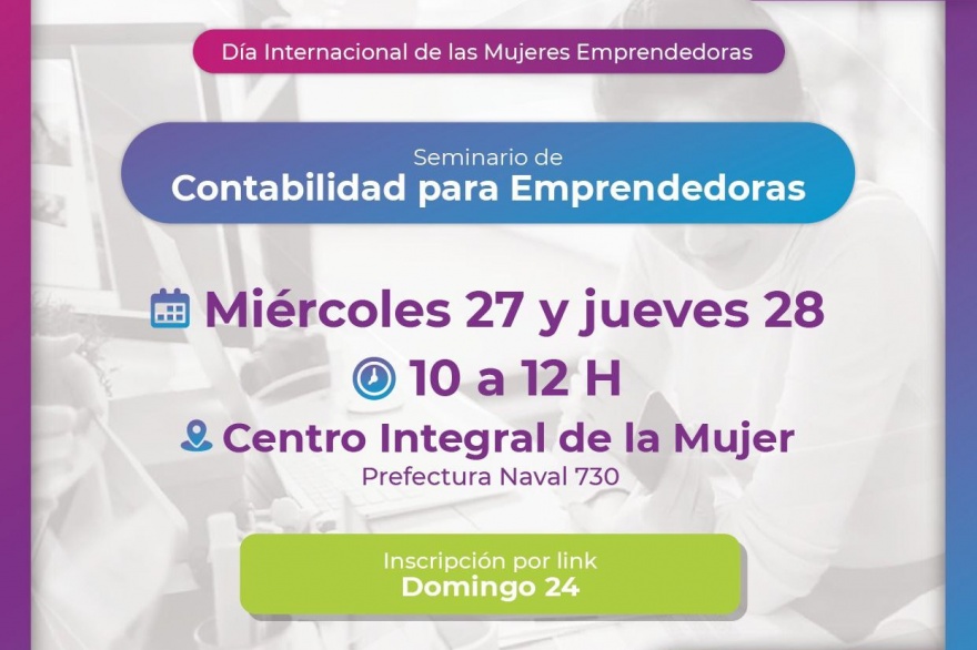 El Seminario de Contabilidad para Emprendedoras se llevará a cabo el miércoles 27 y el jueves 28 de 10 a 12 horas en el Centro Integral de la Mujer (Prefectura Naval 730). Las interesadas en sumarse pueden inscribirse a través del link: https://bit.ly/capacitacionesmujeresemprendedoras.