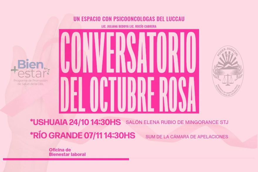 USHUAIA / RÍO GRANDE.- En el marco de la campaña de concientización sobre el Cáncer de Mama, el Poder Judicial invita a toda la comunidad a participar del “Conversatorio del Octubre Rosa”, una propuesta que busca abrir un espacio de reflexión, diálogo y acompañamiento sobre la importancia de la detección temprana, la prevención y el bienestar emocional.