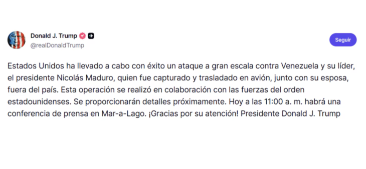“Estados Unidos ha llevado a cabo con éxito un ataque a gran escala contra Venezuela y su líder, el presidente Nicolás Maduro, fue capturado y trasladado en avión junto con su esposa, fuera del país”, escribió en un mensaje en su red Truth Social.