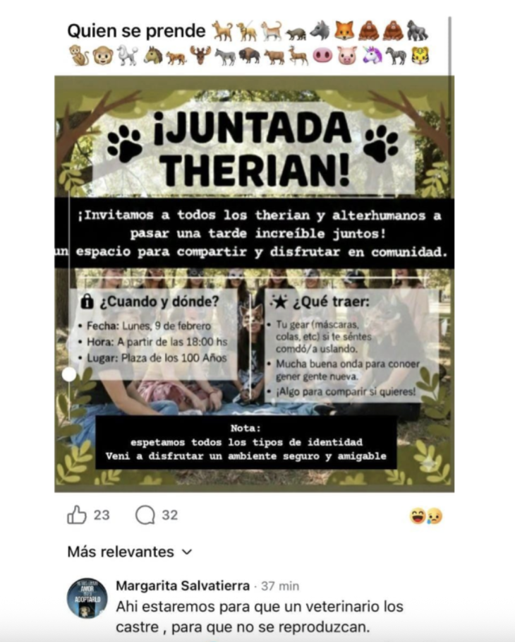 “Invitamos a todos los therian y alterhumanos a pasar una tarde increíble juntos, un espacio para compartir y disfrutar en comunidad”, expresa el mensaje difundido en redes, donde además remarcan que se trata de un ambiente “seguro y amigable” y que se aceptan todo tipo de identidades.